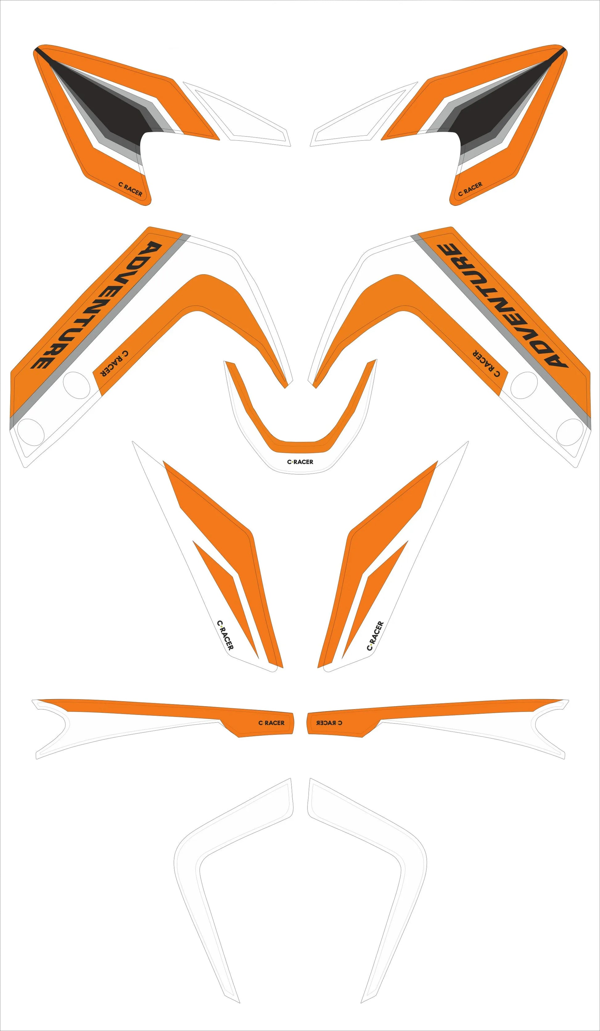 The C-Racer Sticker Kit is specifically designed for the KTM 390 Adventure, providing a perfect fit and seamless integration with your motorcycle's existing bodywork. Each sticker is crafted from high-quality vinyl with a thickness exceeding 0.5 mm, ensuring excellent resistance to abrasions and long-lasting durability. This kit includes stickers for the headlight, side covers, the side-front part of the tank, and the front wing, giving your bike a complete visual transformation. While the kit includes detailed instructions, professional installation is highly recommended to achieve optimal results and ensure the stickers adhere correctly for maximum longevity. The vibrant orange and white color scheme adds a bold and sporty look to your KTM 390 Adventure, making it stand out from the crowd.