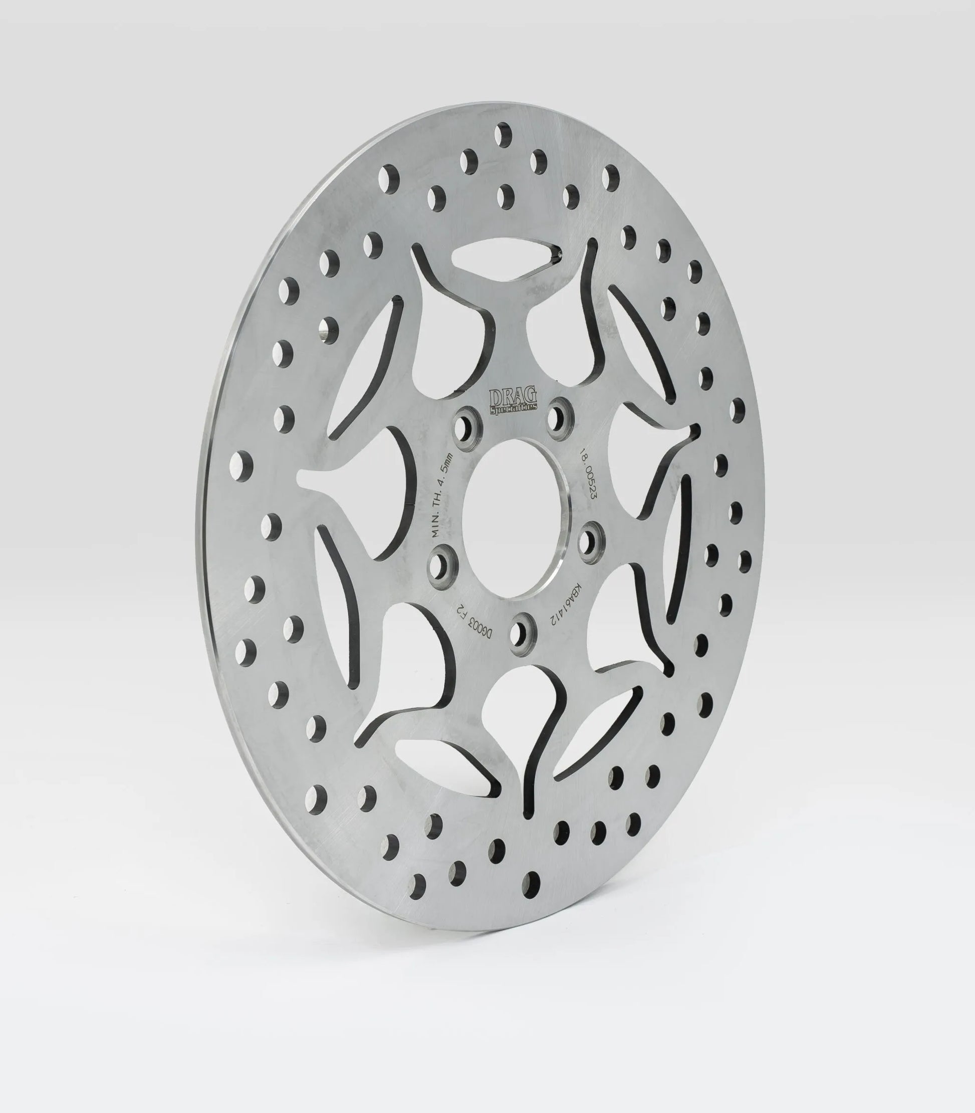 The Drag Specialties F Series Brake Rotor is designed for optimal braking performance. Constructed from 410 high-carbon stainless steel, the rotor benefits from a proprietary heat treatment that ensures homogeneity and consistency throughout its design. The machined surfaces feature a bi-lateral cross-textured grinding process, maintaining rotor runout to no more than 0.01 mm. All non-machined surfaces are finished with an anti-corrosive paint, offering enhanced durability and protection against the elements. Manufactured in Europe to ISO/TS 16949 certified standards, this brake rotor meets or exceeds OEM specifications, ensuring compatibility with all brake pad compounds and aftermarket calipers. Improve your motorcycle's stopping power with this high-quality brake rotor.