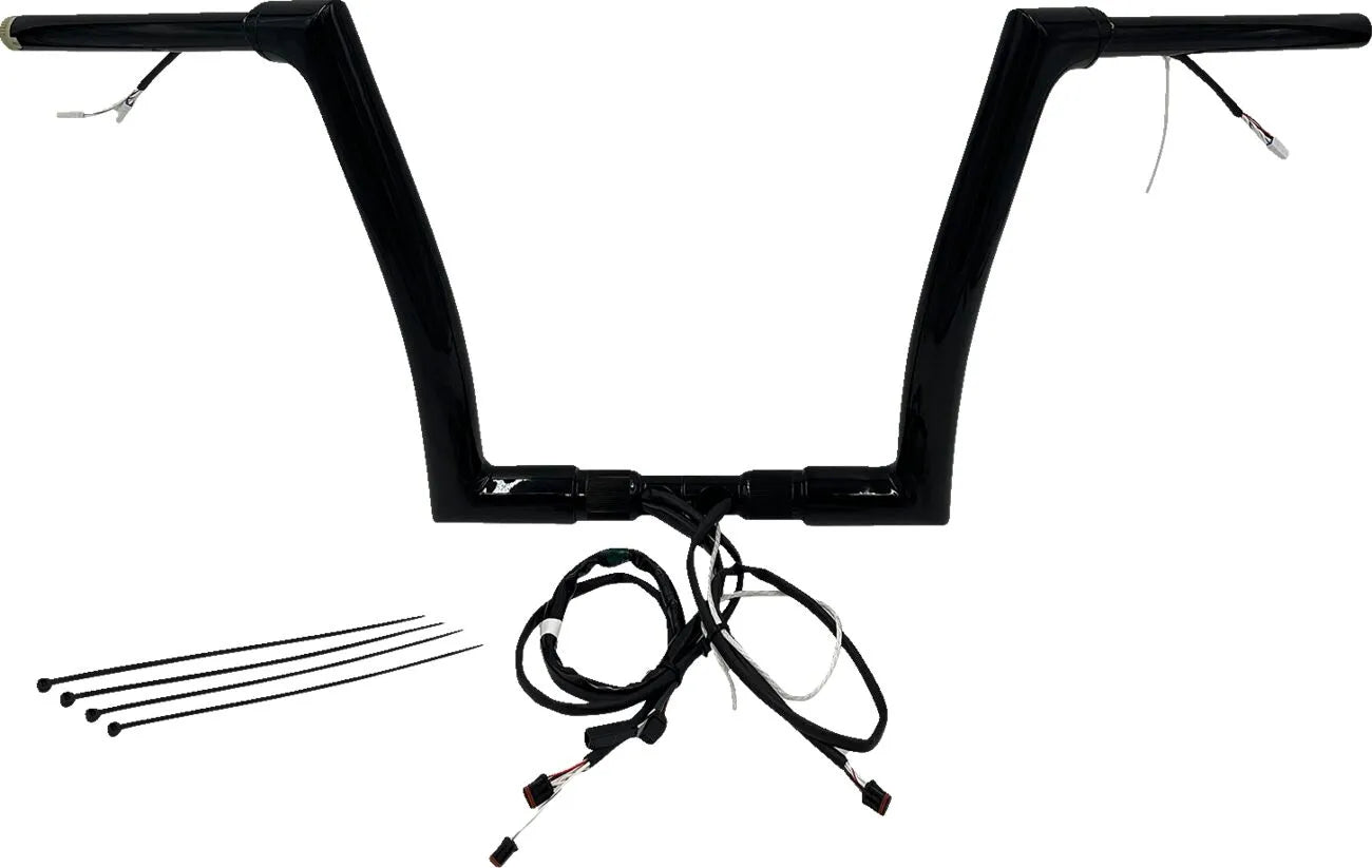 The Fat Baggers Inc. Ez Install Wired 1-1/2" Flat Top Handlebar Kit is engineered for ease of installation and exceptional performance. These handlebars come pre-wired for your handlebar controls, including a throttle-by-wire sensor, allowing you to simply plug them into your motorcycle. The non-welded top corner, machined from billet steel, features a smooth internal wire cavity to protect your internal wiring. The adjustable 1-1/2" collar next to the handlebar controls ensures a custom finished look. CNC mandrel bent from 1-1/2" diameter x 0.095" wall heavy-duty steel tubing, these bolt-together, two-piece handlebars save shelf space and are proudly made in the U.S.A. They extend your existing lines and cables and are compatible with OEM heated grips. Enhance your motorcycle's aesthetics and functionality with this premium handlebar kit, designed for durability, style, and straightforward installation.