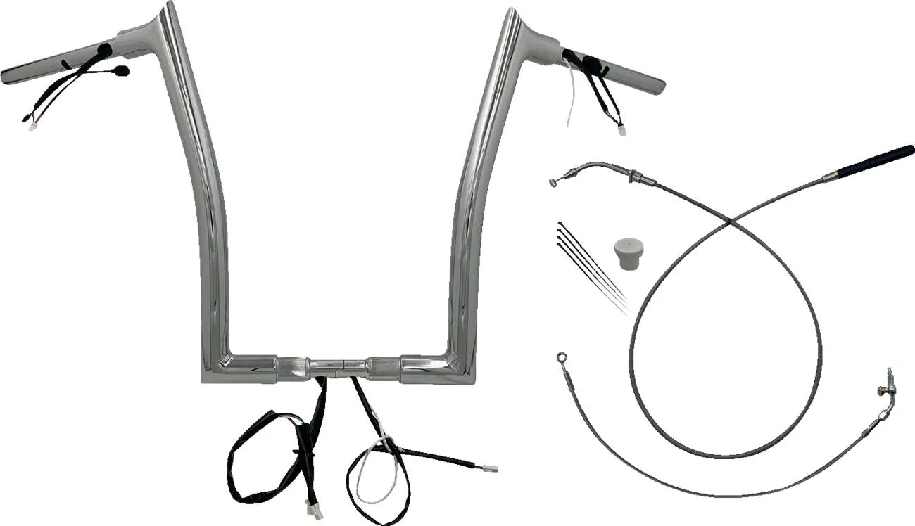 The Fat Baggers Inc. 1-1/2" EZ Install Pointed Top Handlebar is expertly CNC mandrel-bent from heavy-duty 1-1/2" diameter steel tubing with a 0.095" wall, ensuring strength and durability. The innovative bolt-together, two-piece design saves shelf space and simplifies shipping. This handlebar features an adjustable 1-1/2" collar next to the handlebar controls, providing a custom, finished appearance. The "EZ install" design eliminates the struggle with internal wiring, allowing for a quick and easy installation. Squared lower bends and additional slots further simplify wire routing. Knurled and notched for throttle-by-wire (TBW) applications and accepts OEM heated grips for added comfort. With a 1-1/4" clamping diameter and 1" controls diameter, this ape hanger style handlebar offers a rise of 16" and a pullback/sweep of 8". Made in the USA, this handlebar is a testament to quality and craftsmanship.Features & highlights