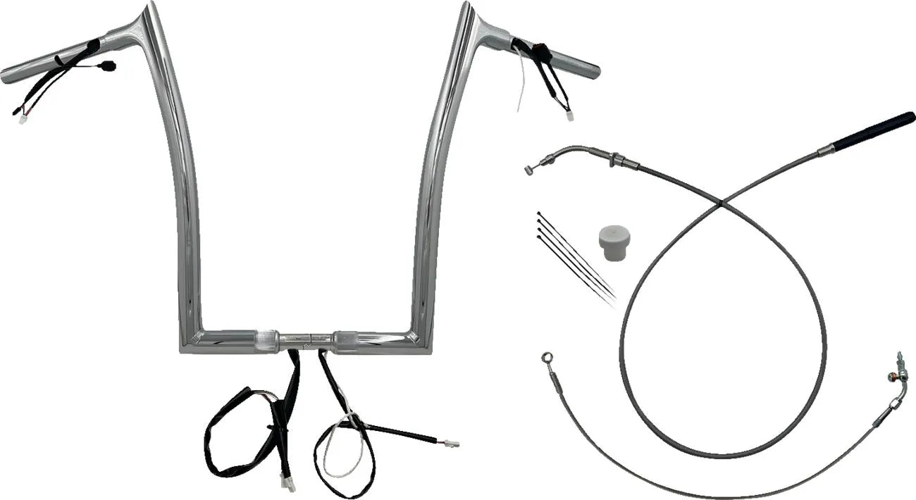 Crafted from high-quality steel, these 1-1/4" diameter handlebars are CNC mandrel-bent for precision and durability. The innovative bolt-together two-piece design simplifies shipping, reduces shelf space, and significantly speeds up installation. The "EZ install" design eliminates the struggle with internal wiring, allowing you to complete the wiring in minutes. The billet machined top features a large internal machined radius, further easing wire pulling. The bar's squared lower bend includes additional slots to optimize wire routing. Knurled and notched for throttle-by-wire (TBW) applications, these ape hanger handlebars seamlessly integrate with your bike's existing controls. Compatible with OEM heated grips, these handlebars offer both comfort and convenience. With a width of 35" and an end rise of 16", these handlebars deliver the perfect combination of style and ergonomics.Features & highlights