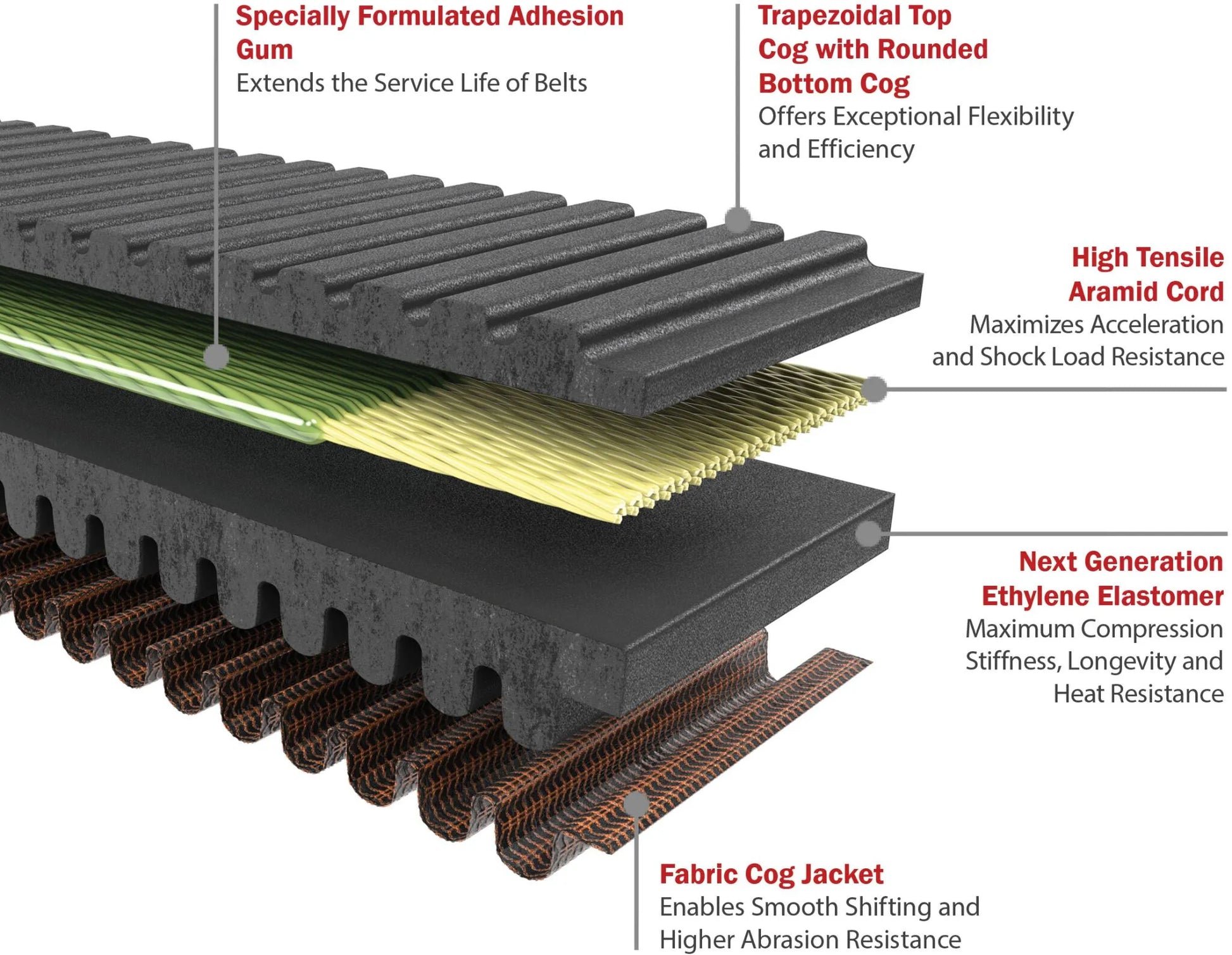 - Aramid cord layer and advanced adhesion promote superior acceleration and shock load resistance.