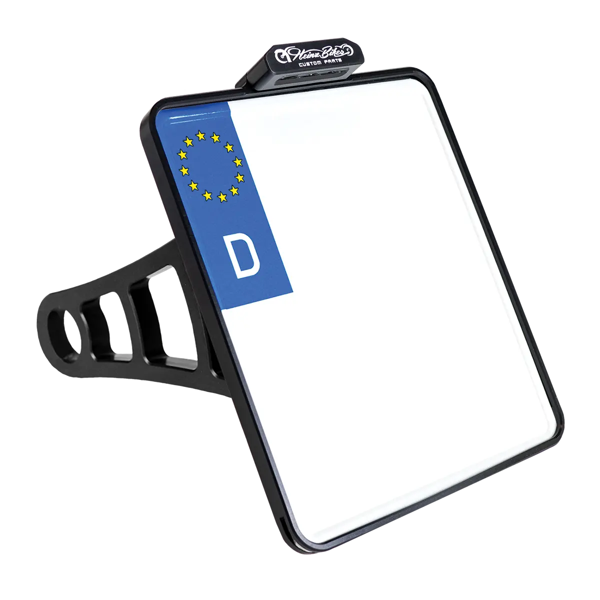 This Heinz Bikes License Plate Side Mount features screw-less mounting utilizing Heinz Bikes™ SLIP-IN frame technology, providing a seamless and secure fit. Integrated LED indicator lights are housed in sleek aluminum casing, offering enhanced visibility and a modern aesthetic. The clever internal cable routing ensures a clean, uncluttered appearance. Constructed from high-quality CNC-machined aluminum, this side mount boasts a stable arm with guaranteed anti-twist technology at the swing arm. This license plate side mount is finished in black anodized for a durable and stylish look. Enhance the rear profile of your motorcycle with this premium license plate solution.Features & highlights