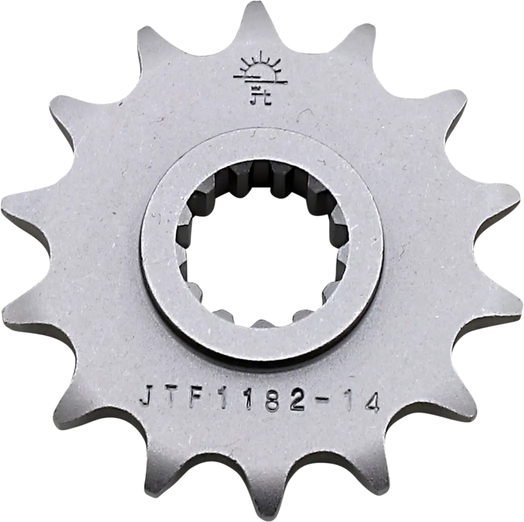 The JT Sprockets Front Sprocket is computer-designed to achieve the optimal balance of strength and minimal weight. Utilizing leading-edge technology and premium materials, JT Sprockets ensures that every sprocket meets or exceeds the stringent quality standards demanded by the motorcycle industry. This front sprocket is heat-treated and bead-blasted to reduce material surface tension, enhancing its lifespan and performance. Compatible with 525 chains, this steel 14-tooth countershaft sprocket provides reliable power transfer and is built to withstand the rigors of demanding riding conditions. Enhance your motorcycle's drivetrain with a sprocket designed for performance and longevity. Easy to install and engineered for a precise fit.