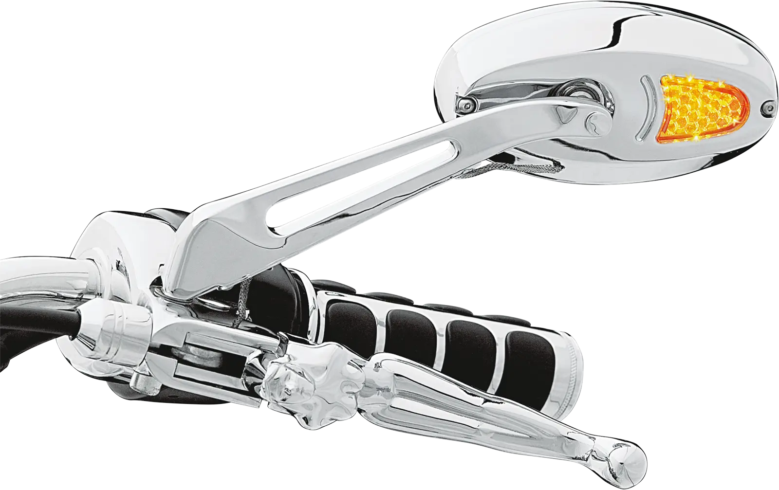 Upgrade your motorcycle's style and safety with Kuryakyn Turn Signal Mirrors. These mirrors not only provide excellent visibility but also integrate bright amber LEDs for auxiliary turn signals, enhancing your presence on the road. With a sleek chrome finish, these mirrors add a touch of custom flair to any bike.