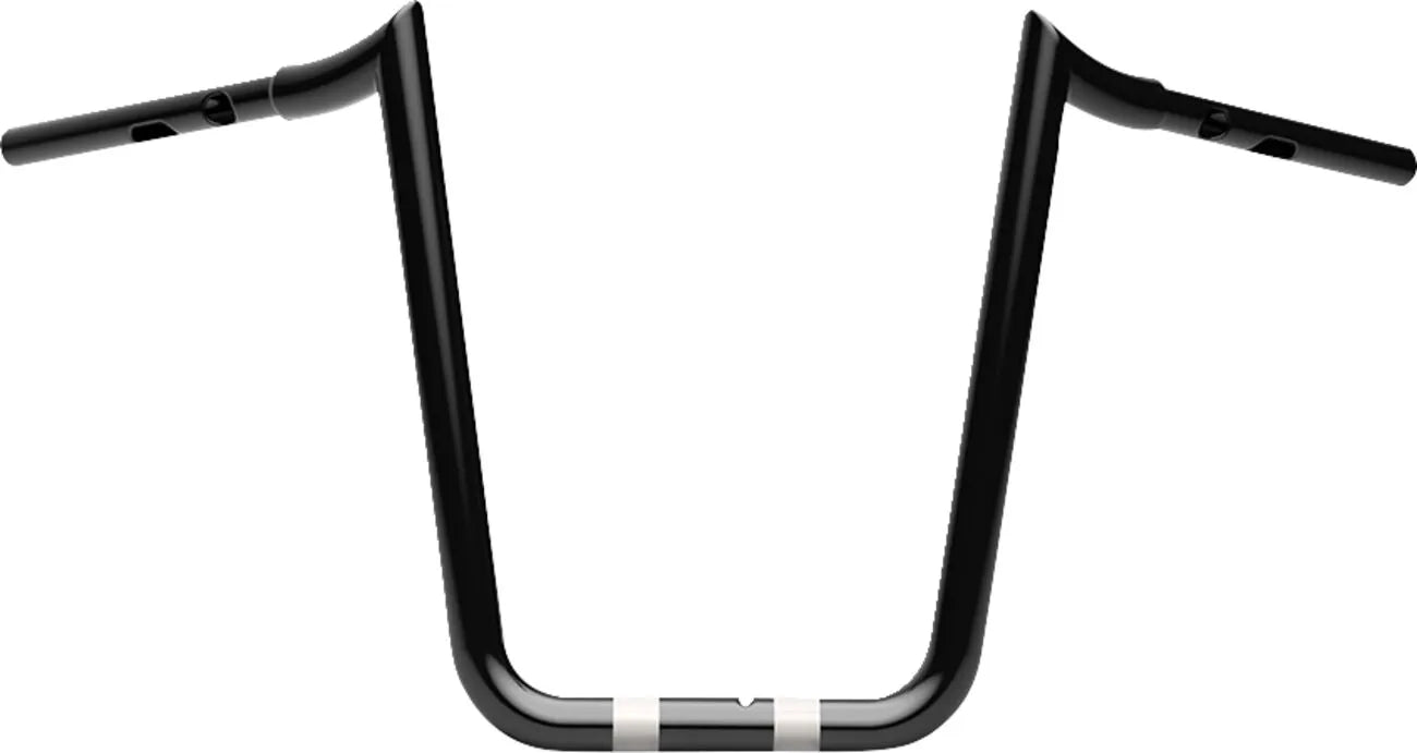 The La Choppers Prime Ape Handlebar is engineered for enhanced comfort and control. Its 14" rise and 8" pullback provide an optimal riding posture, reducing fatigue on long journeys. The handlebar is notched for Throttle-By-Wire (TBW) compatibility and slotted for internal wiring, offering a clean and streamlined appearance. The 3-1/2" on-center knurling ensures a secure grip and prevents slippage. Crafted from high-quality steel with a 1-1/4" diameter, this handlebar offers both durability and style. The 1" controls diameter guarantees compatibility with standard controls. Enhance your bike's aesthetics and performance with this premium handlebar, designed for easy installation and lasting reliability. It is finished in a durable gloss black for long lasting great looks. Measures 35-3/8" in width.