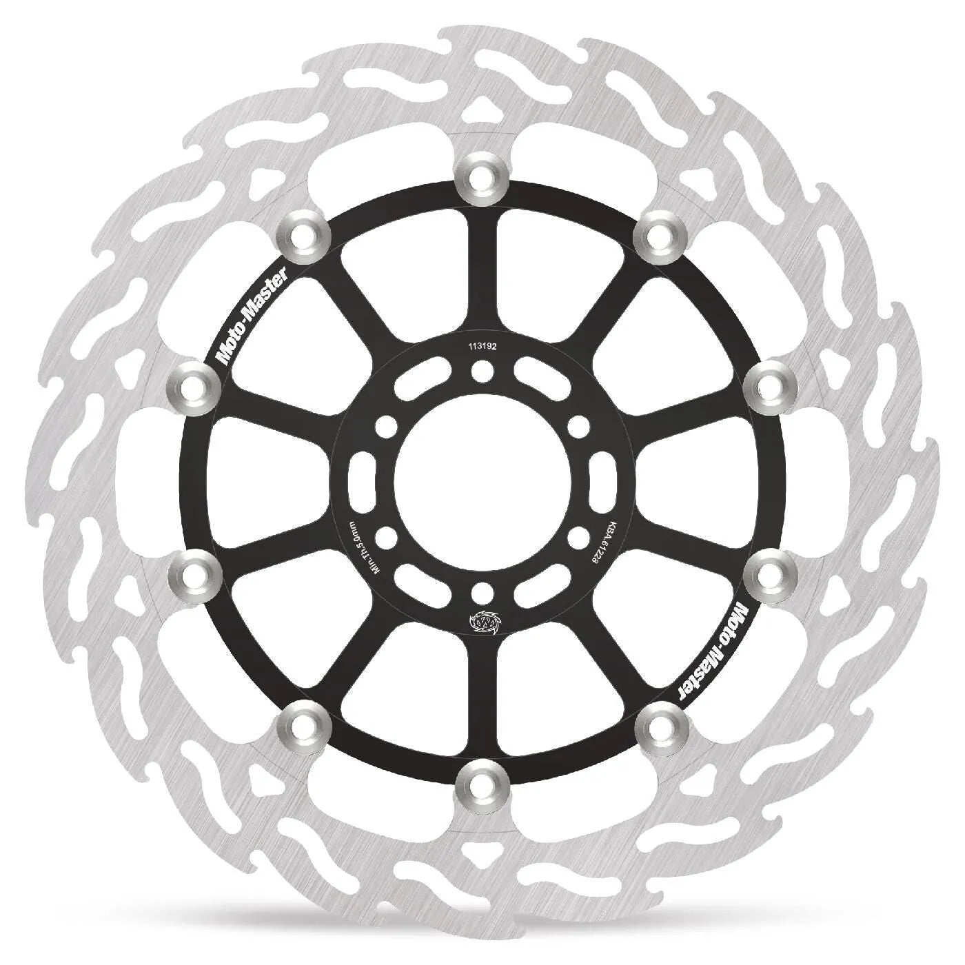 The Moto-Master Flame Series Rotor delivers a bolt-on performance upgrade for your motorcycle. The innovative flame design not only looks aggressive but also ensures optimal heat dissipation and continuous cleaning of the brake pad surface, which optimizes braking consistency. The durable, premium-quality stainless steel outer ring, mounted with lightweight stainless floaters, provides excellent durability and minimal weight. Precision double-ground for excellent rider feedback, this rotor eliminates any pulsation at the lever, providing a smooth and controlled braking experience. Equal brake pad contact throughout the entire rotation of the disc ensures linear braking action and predictable performance. The CNC-machined 6082 billet aluminum, black anodized carrier is both lightweight and strong, contributing to improved handling and overall performance. Compatible with any type of brake pad, this rotor is a versatile and high-performing addition to your motorcycle.