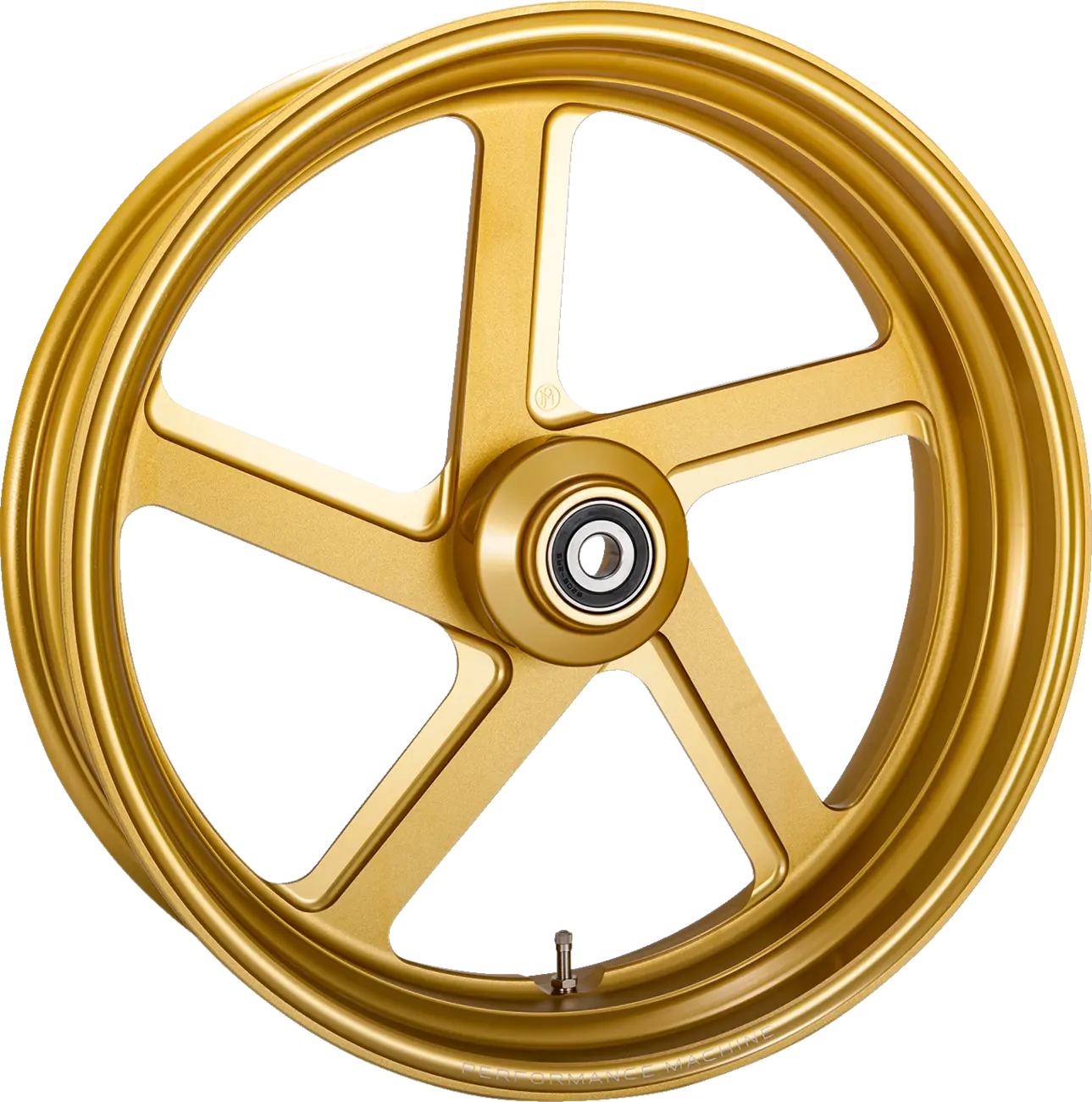 The Performance Machine Pro-AM wheel leverages forging technology to align material strength with operational loads, resulting in a wheel that's both incredibly light and remarkably strong. The unique contour rim lip adds a graceful arc from the rim to the lip, enhancing the overall visual appeal of your bike. This front wheel, sized at 21" x 3.5", is designed for dual disc setups and ABS braking systems, ensuring optimal braking performance and safety. Crafted from high-quality aluminum and finished in a striking machined gold gloss, this wheel not only performs but also elevates the style of your motorcycle. With a 1" axle diameter fitment, it's an ideal upgrade for those seeking both performance and a custom look. The Performance Machine Pro-AM wheel is a testament to American craftsmanship and engineering excellence.