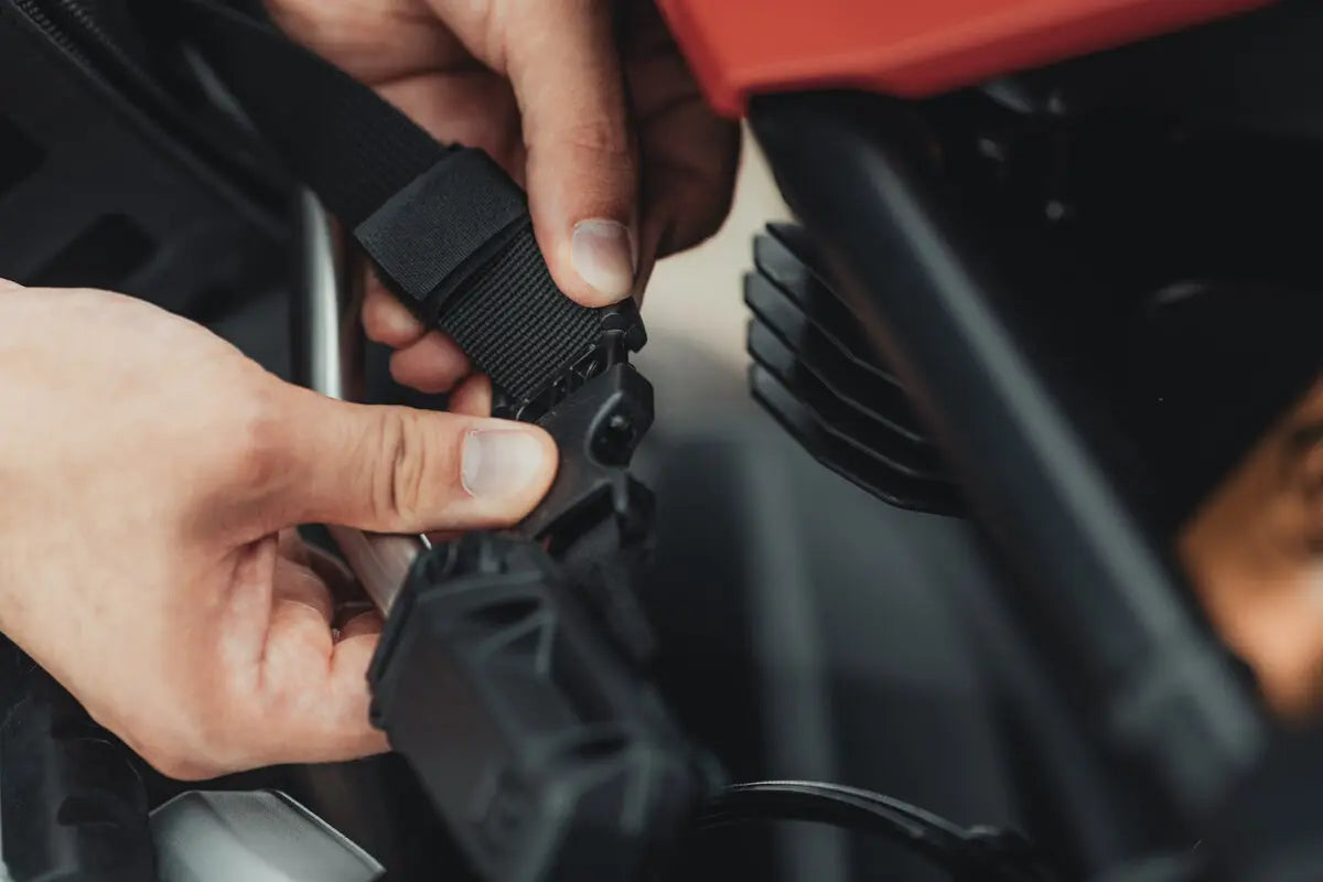 Crafted from lightweight, dimensionally stable EVA material and covered with UV-resistant 1680D nylon, these PRO Blaze H saddlebags protect your gear from the elements. The set includes bike-specific removable support arms that minimize impact on driving dynamics. When not in use, the support arms can be easily detached, leaving only inconspicuous mounting points. A robust hook and loop fastener, coupled with an additional safety belt featuring a click fastener, provides exceptional stability, preventing swinging or flapping even at high speeds. The bags feature a zippered volume expansion, increasing capacity from 15.0 liters to 20.0 liters per bag. MOLLE attachments made of Hypalon material offer versatile accessory mounting options, while reflective details enhance safety in traffic. The water-resistant interior coating adds an extra layer of protection for your belongings. Designed specifically for motorcycles with a high-mounted original exhaust, the PRO Blaze H saddlebags integrate seamlessly with your bike's aesthetics and functionality.
