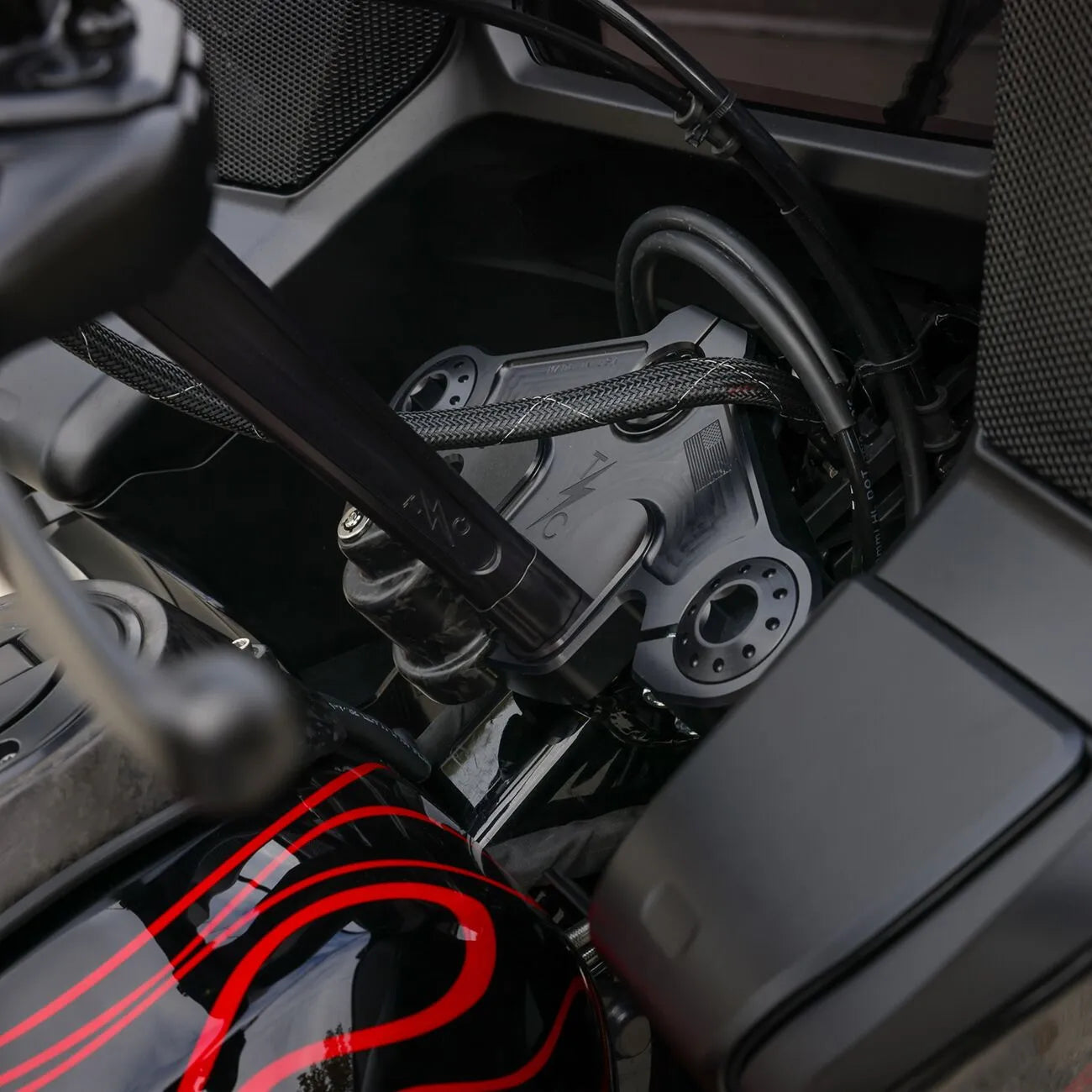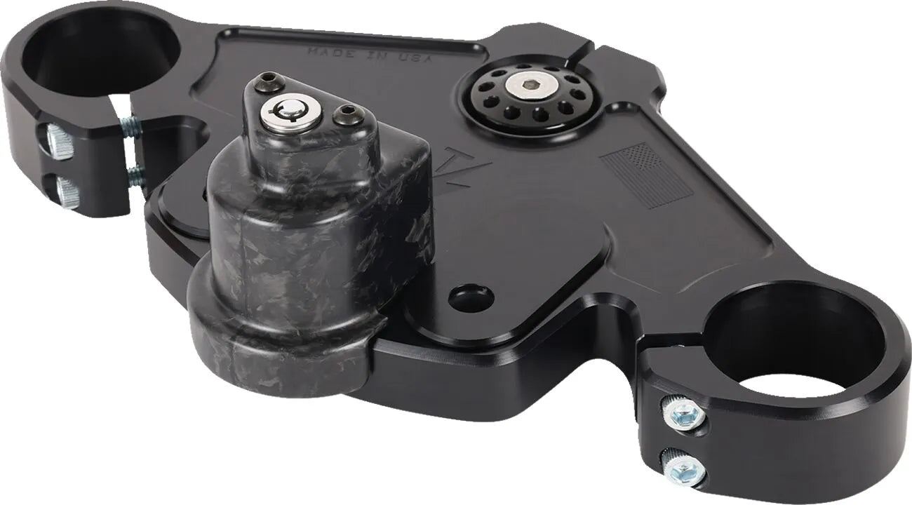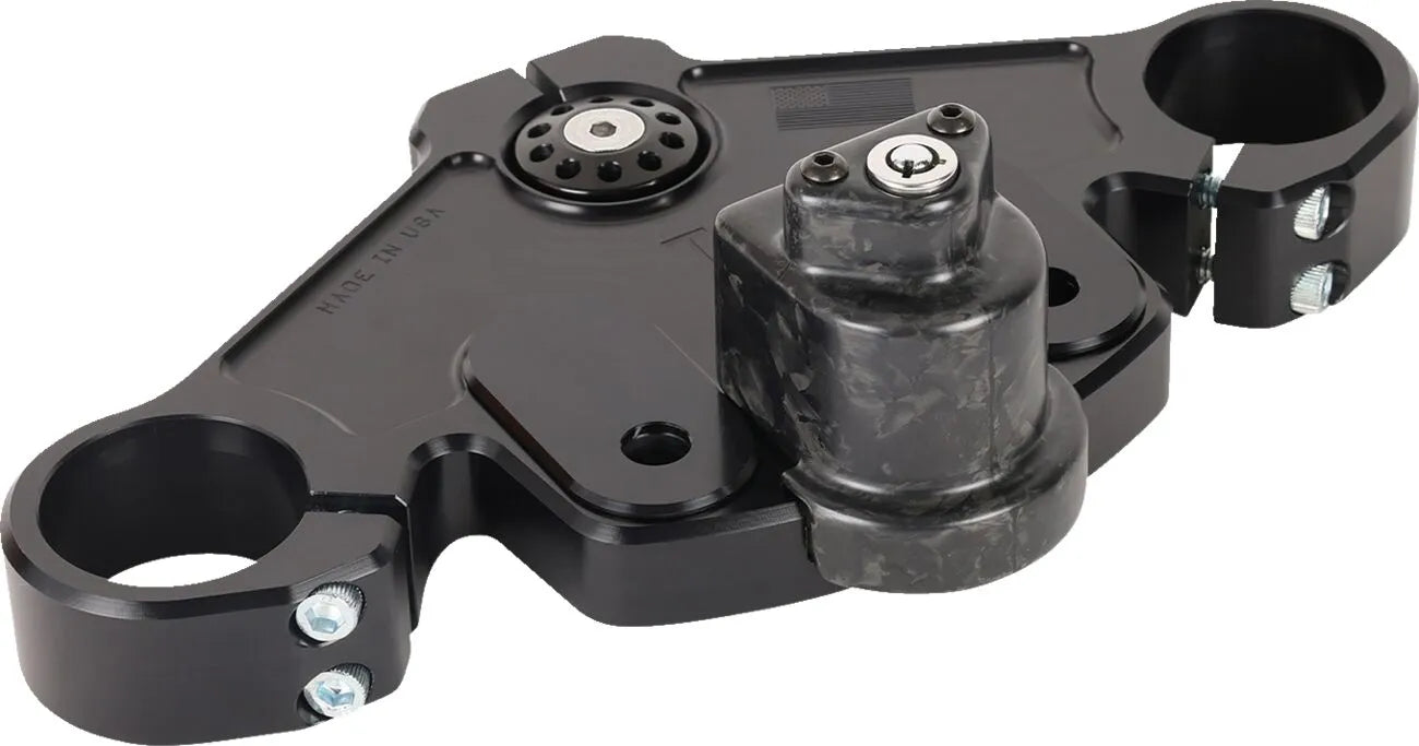 The Thrashin Supply Top Tree offers two riser mounting locations, allowing you to tailor your bike's fitment. Choose the stock location or move 1.35" closer to the rider for a more customized feel. The included block-off plate enables OEM steering lock deletion for a clean, streamlined look. Alternatively, remove the block-off plate and retain your OEM steering lock and key without requiring additional parts. For an added touch of style, consider the optional Carbon Fiber Lock Cover (sold separately). This top tree is constructed from robust 6061-T6 aluminum for maximum strength and durability. Installation is straightforward, with all necessary hardware included, and stock cables will work with a total riser and bar height of up to 15". Also included is a billet stem cap and bolt.