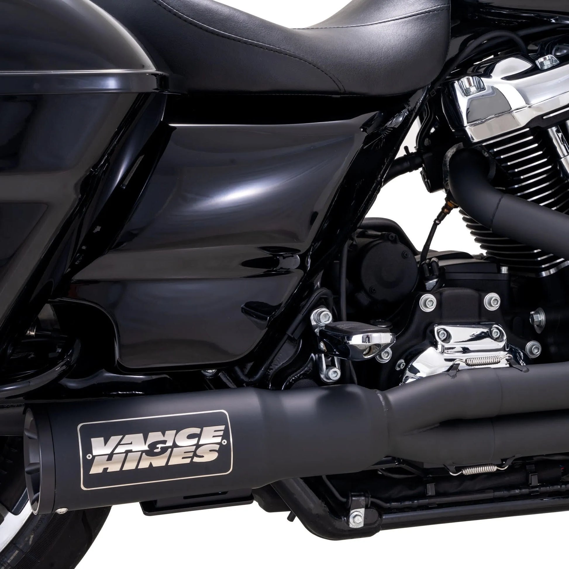 The Vance & Hines Hi Output Exhaust System is designed using PCX™ (Power Chamber Exhaust) technology, incorporating a chambered high-flow catalyst cartridge that significantly boosts torque. The headers are meticulously crafted, stepping from 1-3/4" to 1-7/8" to 2", optimizing exhaust flow and engine performance. Featuring a 4" muffler body and constructed from lightweight, high-grade 304 stainless steel, this system is hand TIG welded to ensure superior quality and longevity. The 2-into-1 design enhances exhaust scavenging, contributing to increased horsepower and a deep, aggressive sound. Designed to fit with standard (non-stretched) saddlebags, this exhaust system combines performance with practicality. Upgrade your ride with Vance & Hines and experience the difference.