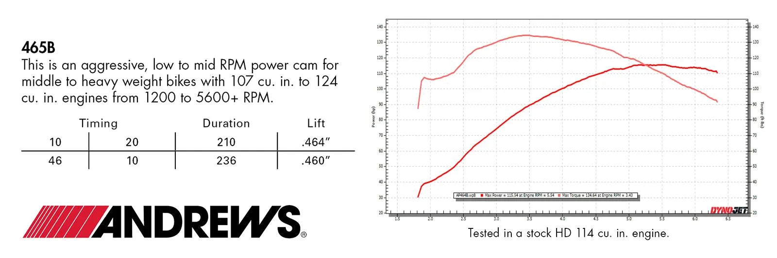 Steigern Sie die Leistung Ihrer Harley-Davidson mit der Andrews 465B Nockenwelle. Diese einfach zu montierende Kettenantriebs-Nockenwelle liefert ein außergewöhnliches Drehmoment im unteren und mittleren Drehzahlbereich und ist damit ideal für schwere und mittelschwere Motorräder. Erleben Sie den Unterschied in Leistung und Ansprechverhalten von 1200 bis 5600 U/min.