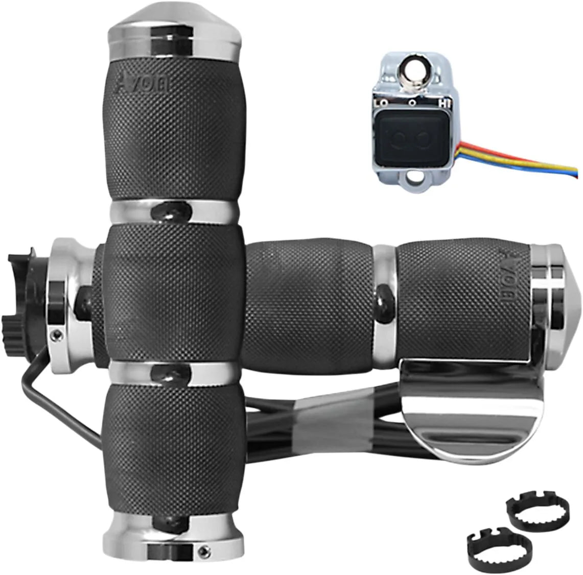 Die beheizbaren Griffe von Avon Grips werden in den USA aus hochwertigem Kraton-Gummi gefertigt. Ihre weiche, geriffelte Oberfläche sorgt für exzellenten Halt und ermöglicht Ihnen, Ihr Motorrad auch unter anspruchsvollen Bedingungen sicher zu kontrollieren. Die integrierte Gasgriffmulde erhöht den Komfort und reduziert die Ermüdung bei langen Fahrten. Die Griffe sind mit Endkappen und Hülsen aus 6061er Billet-Aluminium versehen, was ihnen einen Hauch von Stil und Langlebigkeit verleiht. Die Griffe sind für 1"-Lenker konzipiert, lassen sich einfach montieren und sitzen sicher – die perfekte Aufrüstung für jeden Motorradfahrer, der mehr Komfort und Leistung wünscht. Die schwarz-chromfarbene Oberfläche sorgt für eine ansprechende Optik an jedem Motorrad.
