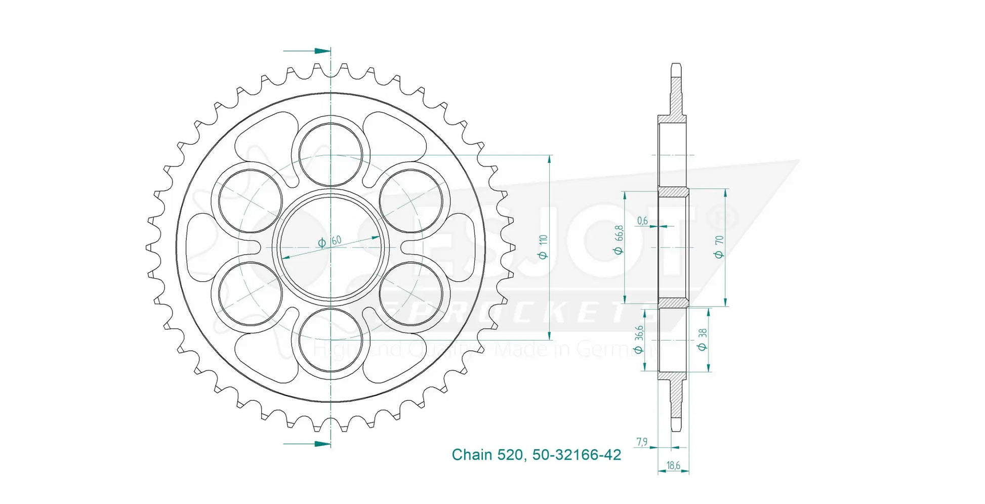 Das Esjot Standard-Kettenrad wird aus hochfestem C45-Stahl gefertigt und mit einer speziellen Oberflächenbehandlung für erhöhte Langlebigkeit versehen. Die präzise Verzahnung, erzielt durch das fortschrittliche Diamond Cut 2.0-Verfahren, garantiert optimalen Ketteneingriff und gleichmäßige Kraftübertragung. Mit Rundlauftoleranzen von unter 0,1 mm minimiert dieses Kettenrad Vibrationen und maximiert die Effizienz. Ob im Stadtverkehr oder auf Offroad-Strecken – das Esjot-Kettenrad bietet konstante Leistung und dauerhafte Wertbeständigkeit. Es wird mit Stolz zu 100 % in Deutschland gefertigt und steht für höchste Ingenieurskunst und Qualität.