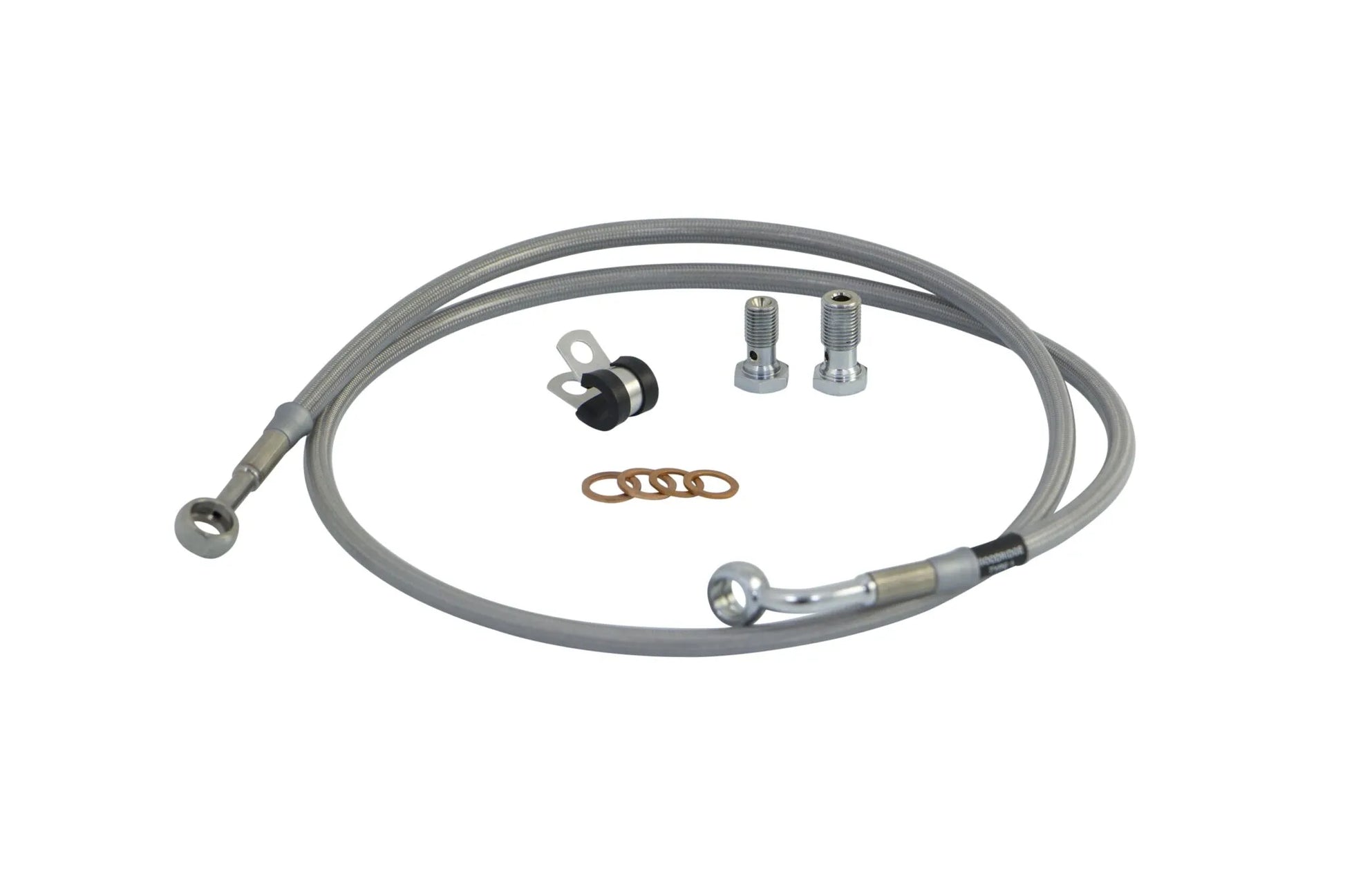 Das Goodridge Bremsleitungskit wurde für überragende Bremsleistung und Zuverlässigkeit entwickelt. Dank des abriebfesten, mit Edelstahlgewebe ummantelten Bremsschlauchs ist dieses Kit besonders langlebig und verschleißfest. Die PTFE-Auskleidung ist mit allen Brems- und Kupplungsflüssigkeiten kompatibel und bietet somit vielseitige Einsatzmöglichkeiten und absolute Sicherheit. Das Bremsleitungskit in Standardlänge beinhaltet verchromte Anschlüsse für eine elegante und sichere Verbindung. Rüsten Sie Ihr Hinterradbremssystem mit Goodridge auf.