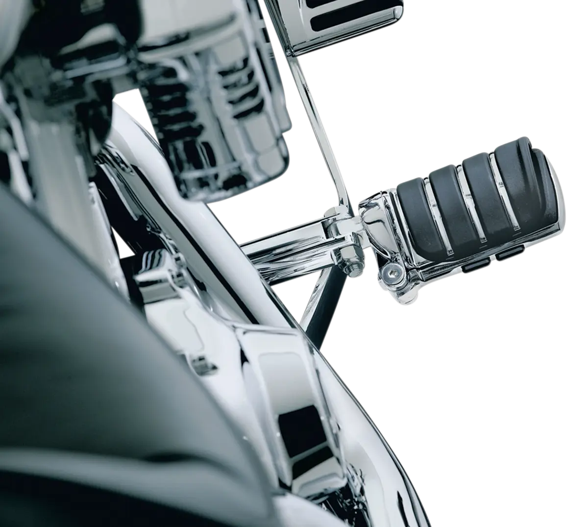 Die Kuryakyn Switchblade™ Fußrasten wurden für optimalen Fahrkomfort und beste Performance entwickelt. Dank ihrer großflächigen, gummierten Konstruktion minimieren sie Vibrationen und bieten sicheren Halt. Die integrierte Fersenstütze lässt sich einfach ausklappen und bietet denselben Komfort wie die Kuryakyn ISO™-Steigbügel – ideal für lange Fahrten und verbesserte Kontrolle. Die Switchblade Fußrasten eignen sich am besten für Motorräder mit vorverlegten Fußrasten oder vorverlegten Fußrasten, sind aber an jeder Position der Fußrasten einsetzbar. Die integrierten Fersenstützen verfügen über Bordsteinkanten-Schutz, die die Fußrasten in Kurven schützen und für zusätzliche Sicherheit sorgen. Gefertigt aus hochwertigem Aluminium mit einer robusten Chrom- und Schwarzlackierung, vereinen diese klappbaren Fußrasten Stil und Langlebigkeit.