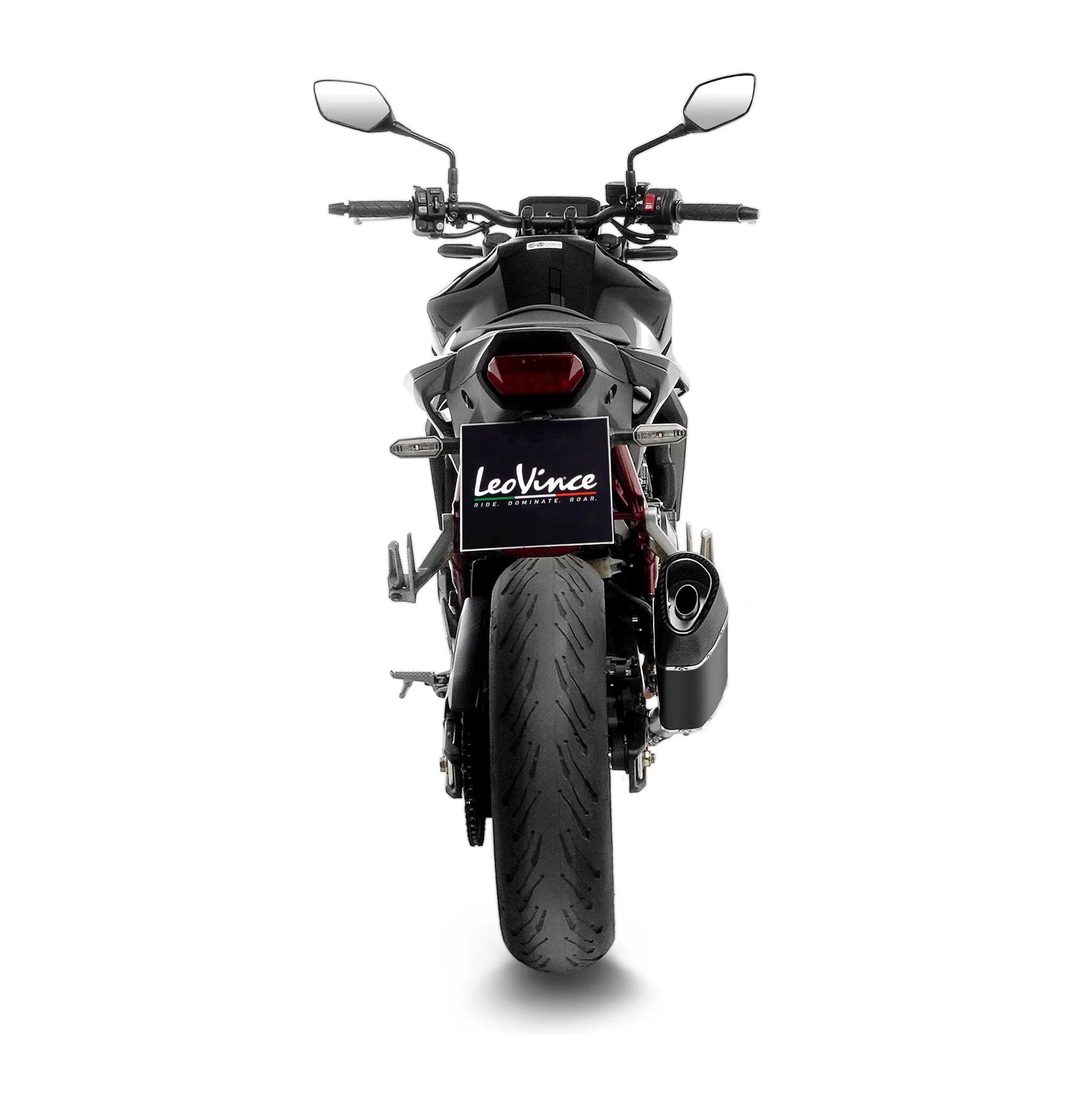 Die LV-14R Black Edition besticht durch ihr markantes Tri-Oval-Design und einen mattschwarzen Edelstahl-Schalldämpfer, der durch eine elegante Endkappe aus Carbonfaser in edlem Schwarz ergänzt wird. Im Inneren sorgt ein spezielles, hochtemperaturbeständiges Dämmmaterial für eine sorgfältige Handmontage um einen geraden, mit einem herausnehmbaren dB-Killer ausgestatteten Schalldämpferkern. Dieses Design liefert den unverwechselbaren LeoVince-Auspuffsound und optimiert gleichzeitig die Leistung. Alle WIG-Schweißnähte werden von erfahrenen Technikern präzise und sorgfältig von Hand gefertigt, was außergewöhnliche Langlebigkeit und dauerhafte Zuverlässigkeit garantiert. Die Montage ist dank des Slip-On-Designs unkompliziert. Die LV-14R Black Edition ist ECE-typgeprüft und erfüllt somit die europäischen Normen.