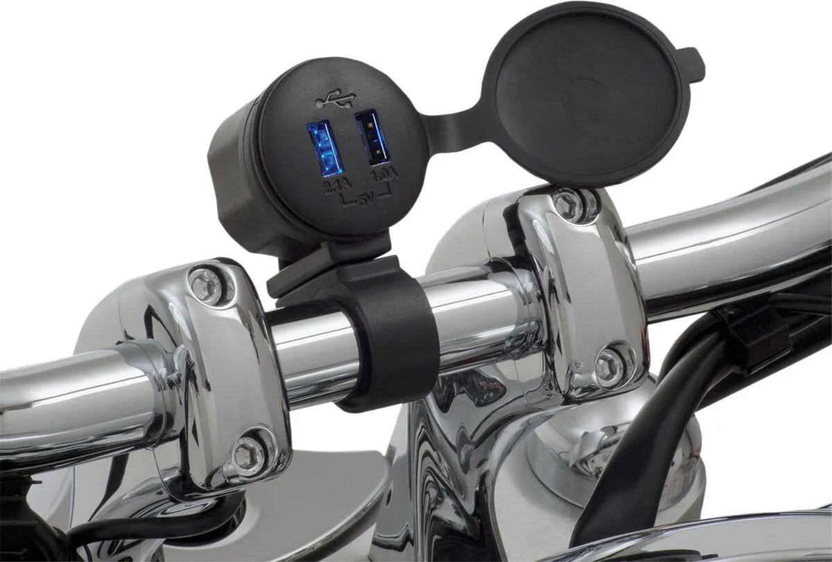 Das Show Chrome Dual-Port-USB-Ladegerät versorgt Ihre Mobilgeräte zuverlässig mit Strom. Es verfügt über einen 2,1-A-Anschluss zum schnellen Laden von Tablets und einen 1,0-A-Anschluss für Smartphones und andere Geräte, sodass Sie beide gleichzeitig nutzen können. Das robuste Design garantiert eine lange Lebensdauer, und dank der kompakten Größe lässt es sich problemlos in Ihr Motorrad-Setup integrieren. Ob auf einer langen Reise oder einem kurzen Arbeitsweg – mit diesem USB-Ladegerät sind Ihre wichtigsten elektronischen Geräte immer einsatzbereit. Die Installation ist kinderleicht: Die mitgelieferte Lenkerklemme passt sowohl für 7/8"- als auch für 1"-Lenker. Die Ladebuchse kann für individuelle Anwendungen auch in eine ebene Platte eingebaut werden. Mit dieser vielseitigen und effizienten USB-Ladelösung sind Ihre Geräte immer mit Strom versorgt.