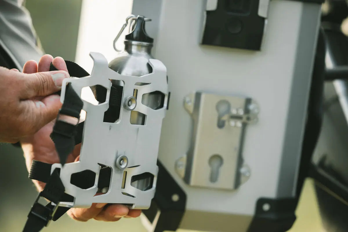 Mit dem SW-Motech Trax Flaschenset sind Sie bestens für Ihr nächstes Abenteuer gerüstet. Dieses Set ermöglicht Ihnen den sicheren Transport von Flüssigkeiten wie Wasser oder Kraftstoff an Ihren TRAX Aluminium-Seitenkoffern und sorgt so dafür, dass Sie für jede Reise, insbesondere abseits befestigter Wege, optimal ausgerüstet sind. Die Flaschen sind mit wenigen Handgriffen leicht zugänglich und bieten Ihnen jederzeit bequeme Flüssigkeitszufuhr oder Kraftstoffzufuhr, wenn Sie diese am dringendsten benötigen.