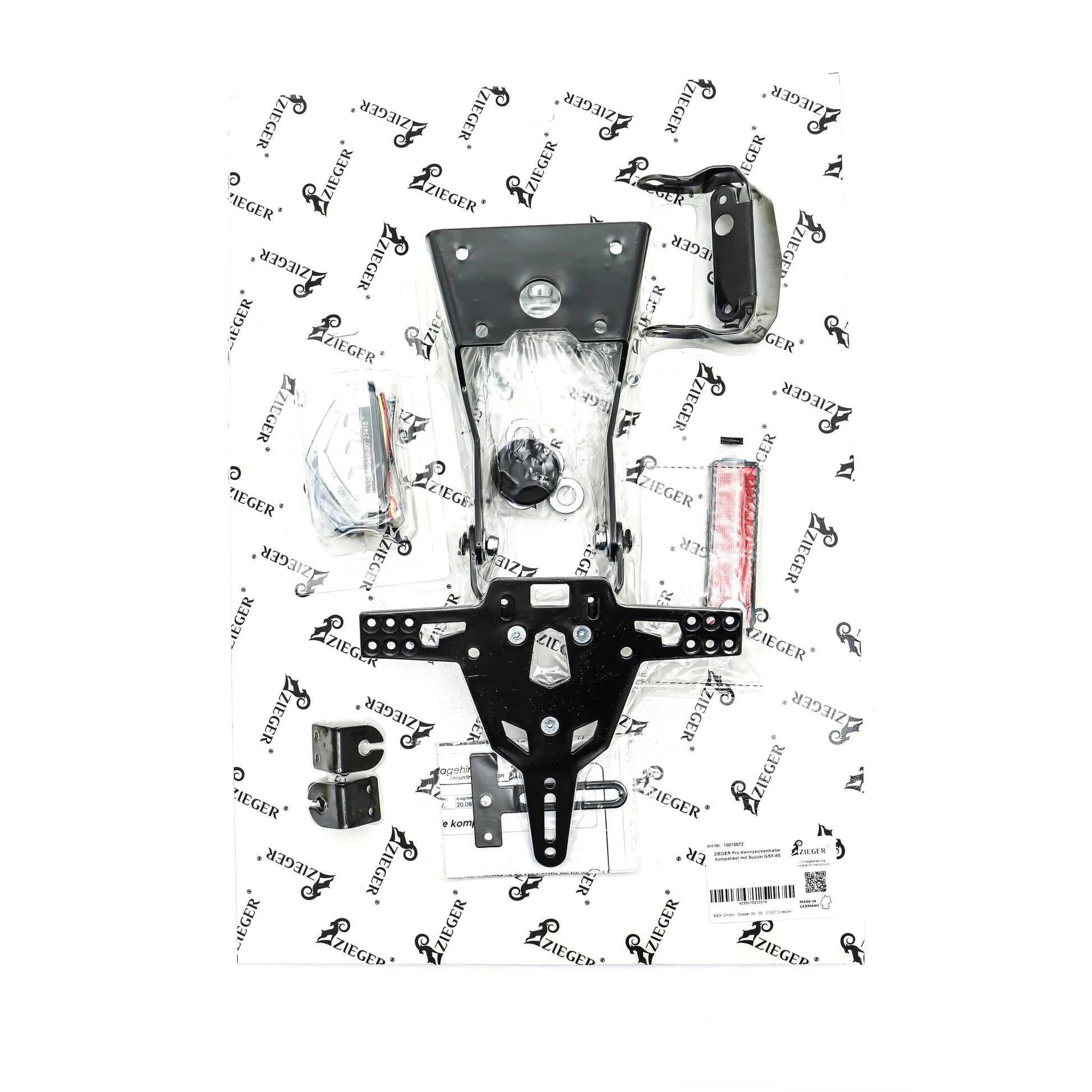 Werten Sie die Optik Ihres Motorrads mit dem Zieger Pro Kennzeichenhalter auf. Dieser robuste und wetterfeste Kennzeichenhalter besticht durch sein schlankes, sportliches Design und bietet eine sichere und stilvolle Befestigungsmöglichkeit für Ihr Kennzeichen.